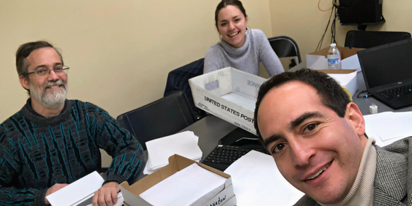 A few members of the Parental Rights team preparing a mailing in the office. From left to right, Michael Ramey, Natalie Clarke, Will Estrada.